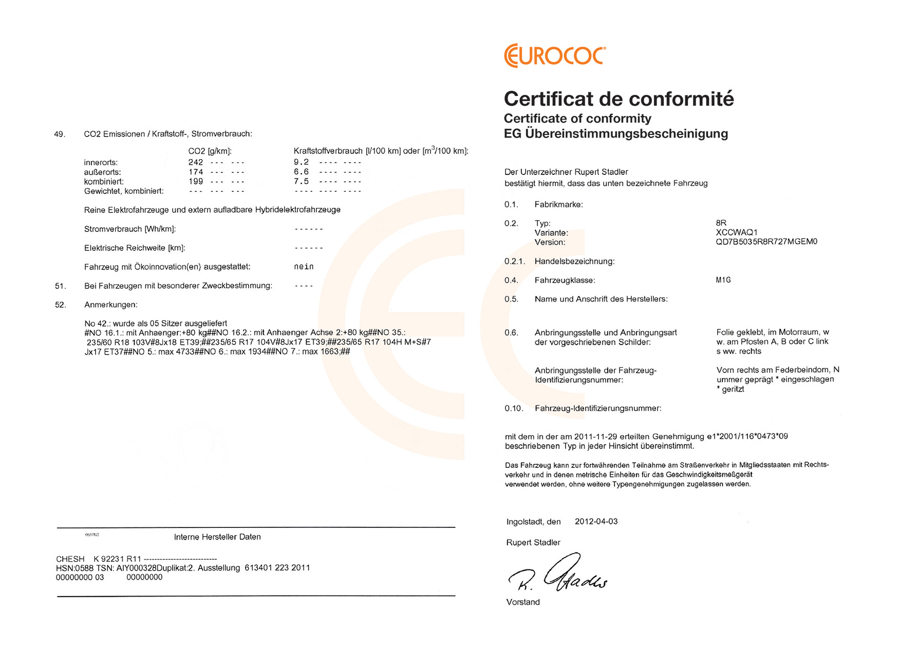 Once everything is confirmed, your COC is ordered from the official source. The data printed on the certificate is based on the original type approval information for your vehicle. -