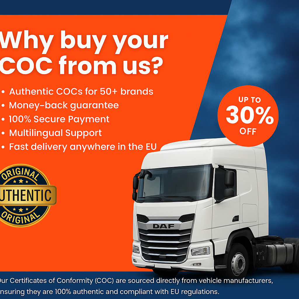 Get your official, authentic DAF Certificate of Conformity (COC), recognized across all EU countries. This document proves your vehicle meets EU regulations and is required for registration or import in most European states. Issued by DAF accepted by all authorities.