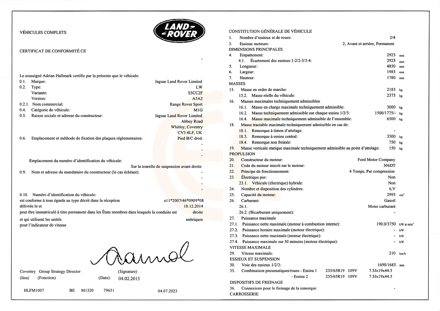 Certificate of Conformity LAND ROVER