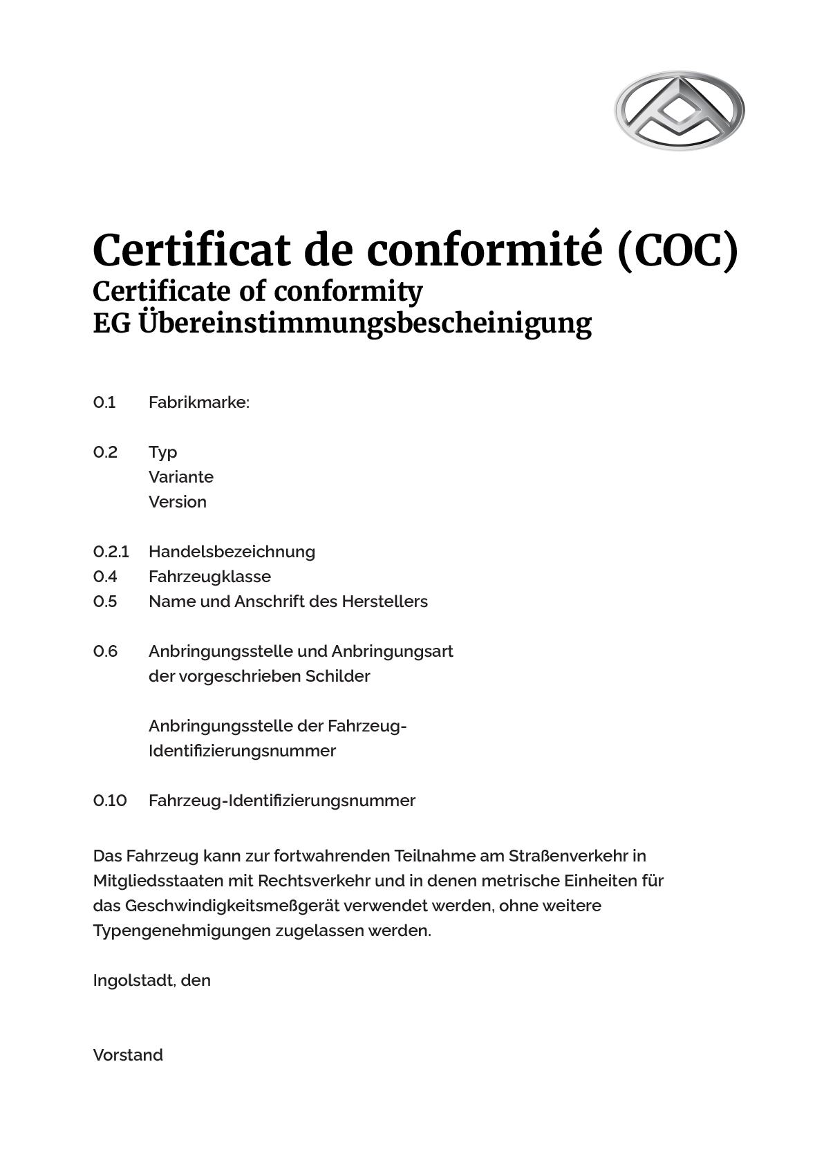 Once everything is confirmed, your COC is ordered from the official source. The data printed on the certificate is based on the original type approval information for your vehicle. -