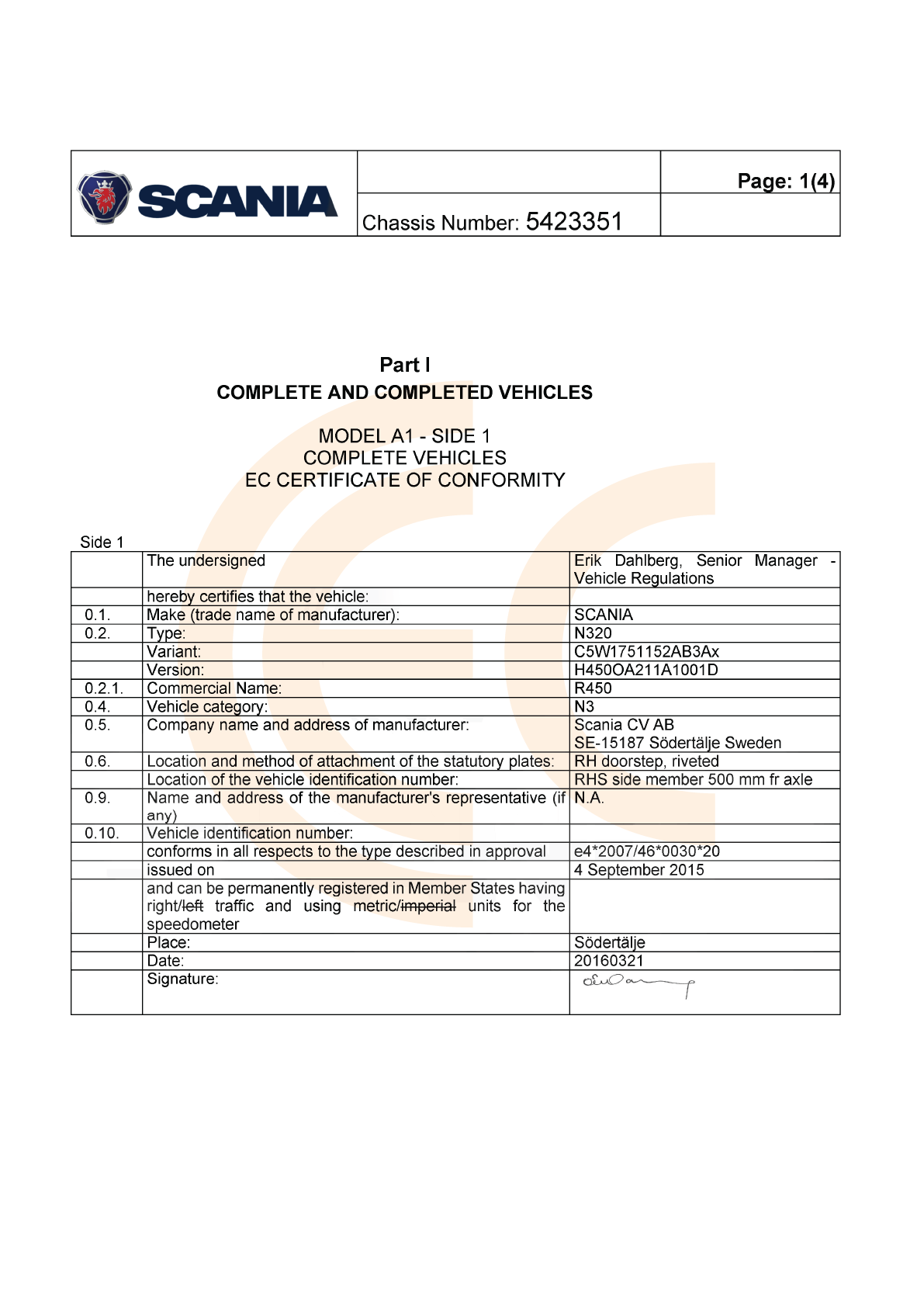 Certificate of Conformity SCANIA