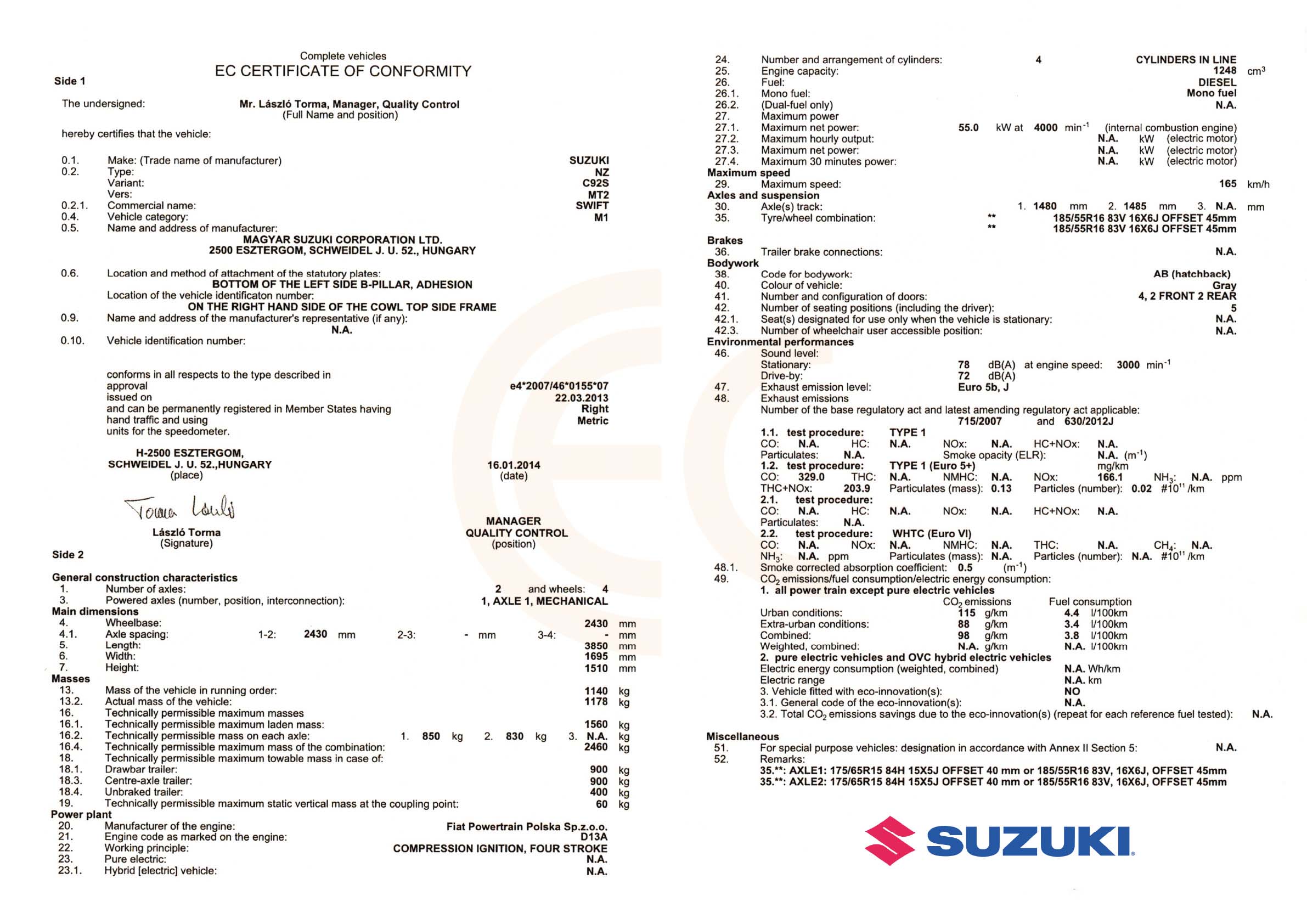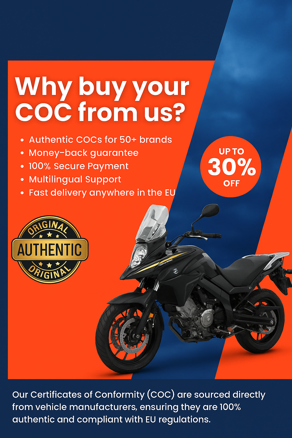 Get your official, authentic SUZUKI MOTO Certificate of Conformity (COC), recognized across all EU countries. This document proves your vehicle meets EU regulations and is required for registration or import in most European states. Issued by SUZUKI MOTO, accepted by all authorities.