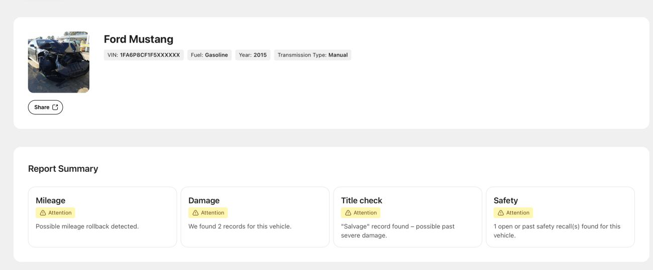 When you check your VIN through our platform, the report is based on neutral, verified data sources. We do not sell cars and we are not affiliated with sellers. The information is compiled from insurance databases, official registers, mileage records, and cross-border data networks.